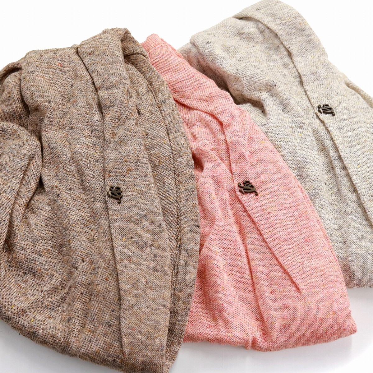 1年中いつでも着用可能な締め付け感のない汎用性の高いニットターバンです。薄手ですが、ネップ入り天竺リネン生地を二枚重ねて作ることにより、空気の層ができ、寒い季節でも見た目の薄さよりぐんと暖かく感じます。軽くてかぶっているのを忘れてしまうほどの楽なかぶり心地がこの商品の魅力で、通年通して使用できます。シンプルですが、良く見るとわずかに糸が光って見え、生地自体の落ち感がしなやかできれいです。生地にポコポコとしたネップが見られるので麻特有のシャリ感や素材感を活かされています。